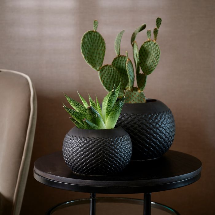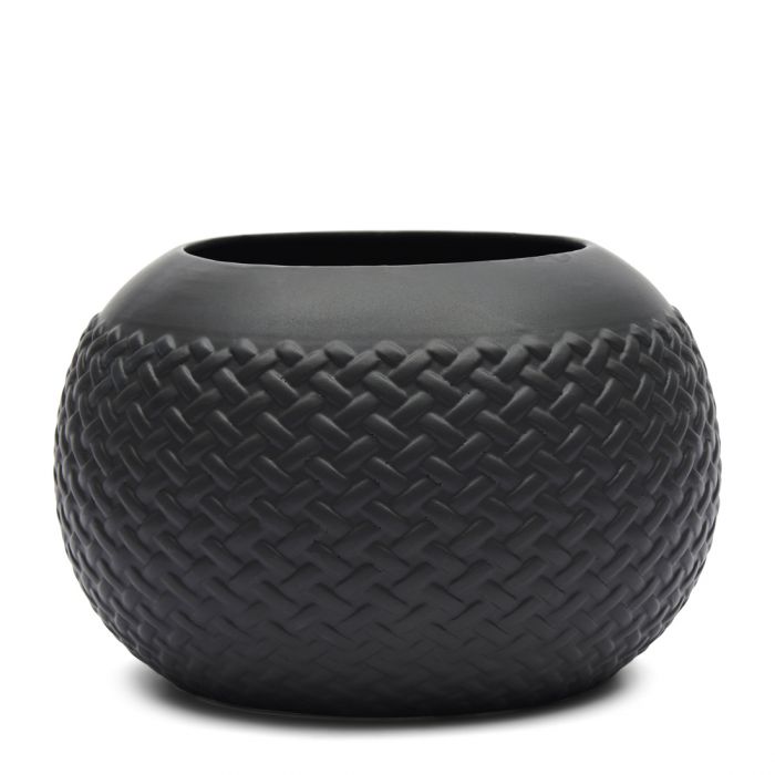 Ez a fekete porcelán kaspó gyönyörű fonott mintával ellátott domborművet tartalmaz. Ha egy kicsit nagyobb cserepes növényt szeretne elhelyezni a padlón, akkor ez a kerek cserép a maga 27 centiméter átmérőjével jó választás. Ez a kaspó többféle méretben kapható.