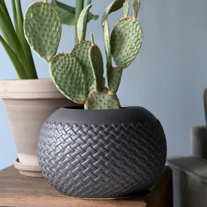 Ez a fekete porcelán kaspó gyönyörű fonott mintával ellátott domborművet tartalmaz. Ha egy kicsit nagyobb cserepes növényt szeretne elhelyezni a padlón, akkor ez a kerek cserép a maga 27 centiméter átmérőjével jó választás. Ez a kaspó többféle méretben kapható.