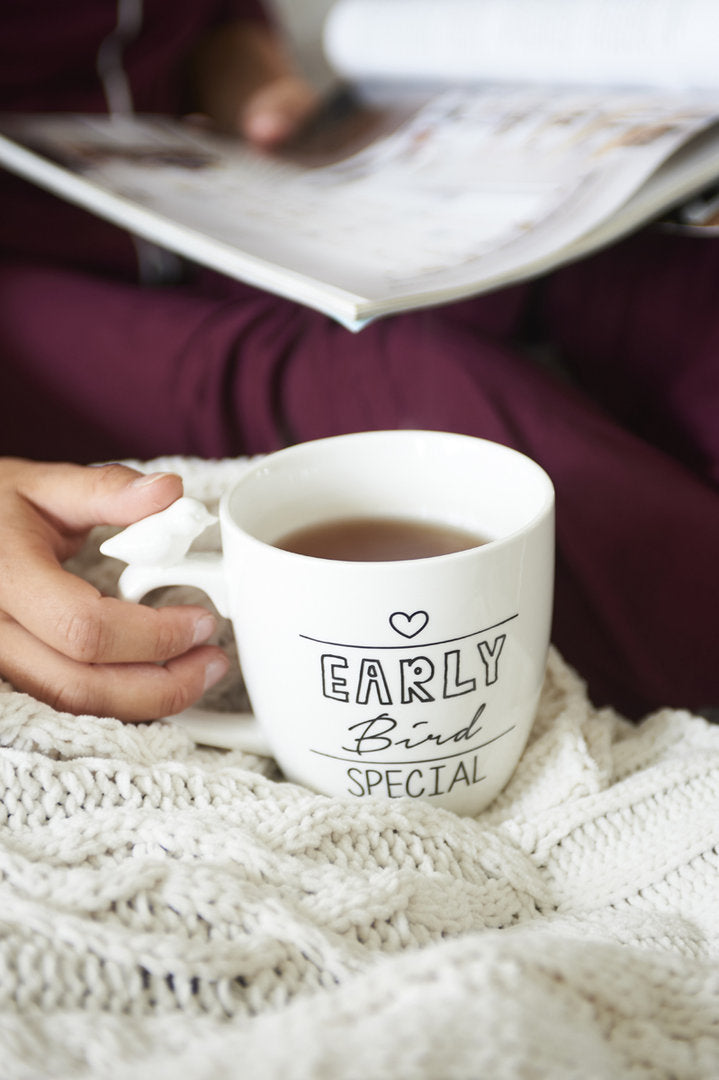 10x13cm-es porcelán bögre madár figurával, Early Bird Special felirattal.
