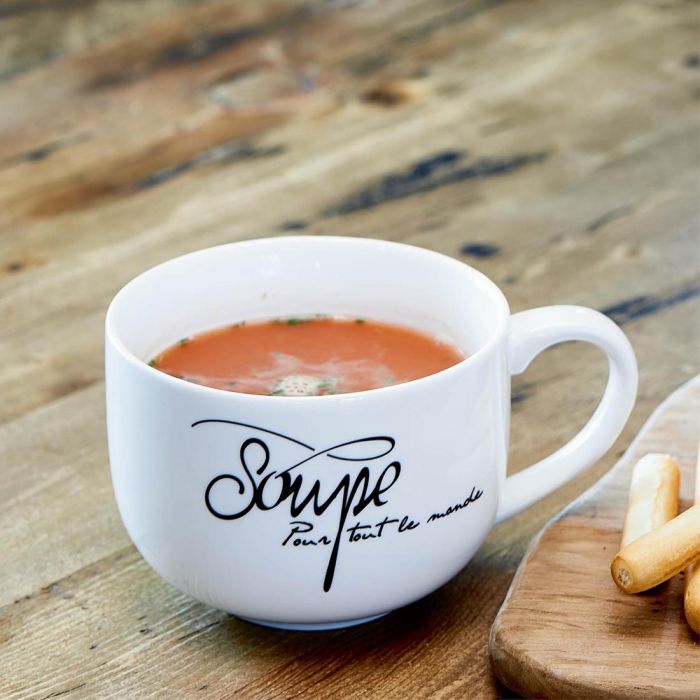 8x8,5 cm-es porcelán leveses csésze a Riviera Maisontől Soupe Pour Tout Le Monde felirattal.